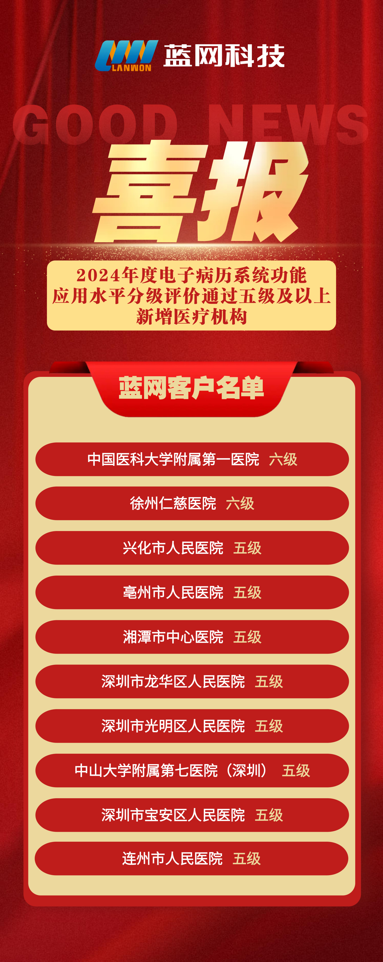 喜讯丨蓝网科技助力10家医院通过2024年电子病历五级及以上评审发表时间:2025-07-23 18:00 ![]() 7月14日,国家卫生健康委医院管理研究所印发《关于公示 2024 年度电子病历系统功能应用水平分级评价新增高级别医疗机构结果的通知》,将 2024年度电子病历系统功能应用水平分级评价通过五级及以上新增医疗机构拟定名单予以公示。 ![]() 以电子病历为核心驱动的医院信息化建设,始终是新医改的关键着力点。电子病历系统评级作为核心评价机制,能够有效推动临床数据治理体系的完善,显著提升医疗大数据质量,破解“数据沉睡”困局。