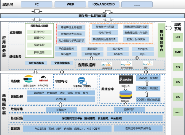 系统架构 蓝网影像云平台与信服云托管云、超融合(HCI)、分布式存储(EDS)通过兼容性测试,形成了从基础服务层、应用服务层、展示层三个维度分层设计的可面向用户直接交付的联合解决方案。 主要功能如下: